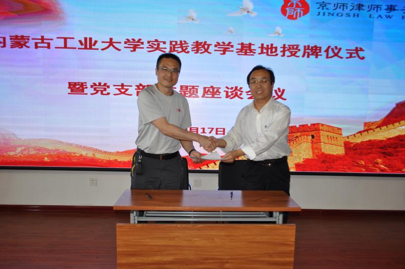 2018年5月17日,yl6809永利官网集团法学系与京师律师事务所在呼和浩特京师律师事务所联合举行实践教学基地揭牌仪式暨主题党日活动。yl6809永利官网集团党总支书记马利强、院长文宗川教授、副院长苏丽娜副教授,以及京师律师事务所满天星学院院长张振业、满天星学院副院长杜广树、执行主任覃金金等人出席此次活动。yl6809永利官网集团法学系教工党支部全体党员教师及京师律师事务所全体党员律师参加了此次活动。法学系教工党支部书记王寅与京师律师事务所徐杰主任联合主持了本次活动。