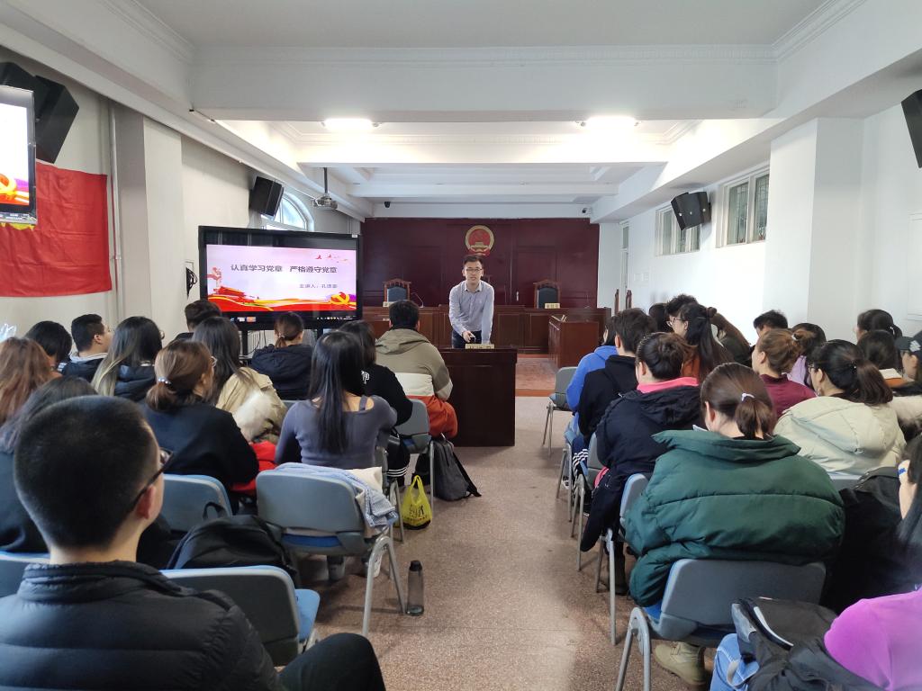 20191116日,yl6809永利官网集团于模拟法庭开展2019年积极分子培训班第四讲,我院法学系学生党支部书记孔德豪主讲,全体入党积极分子共60余人参加。