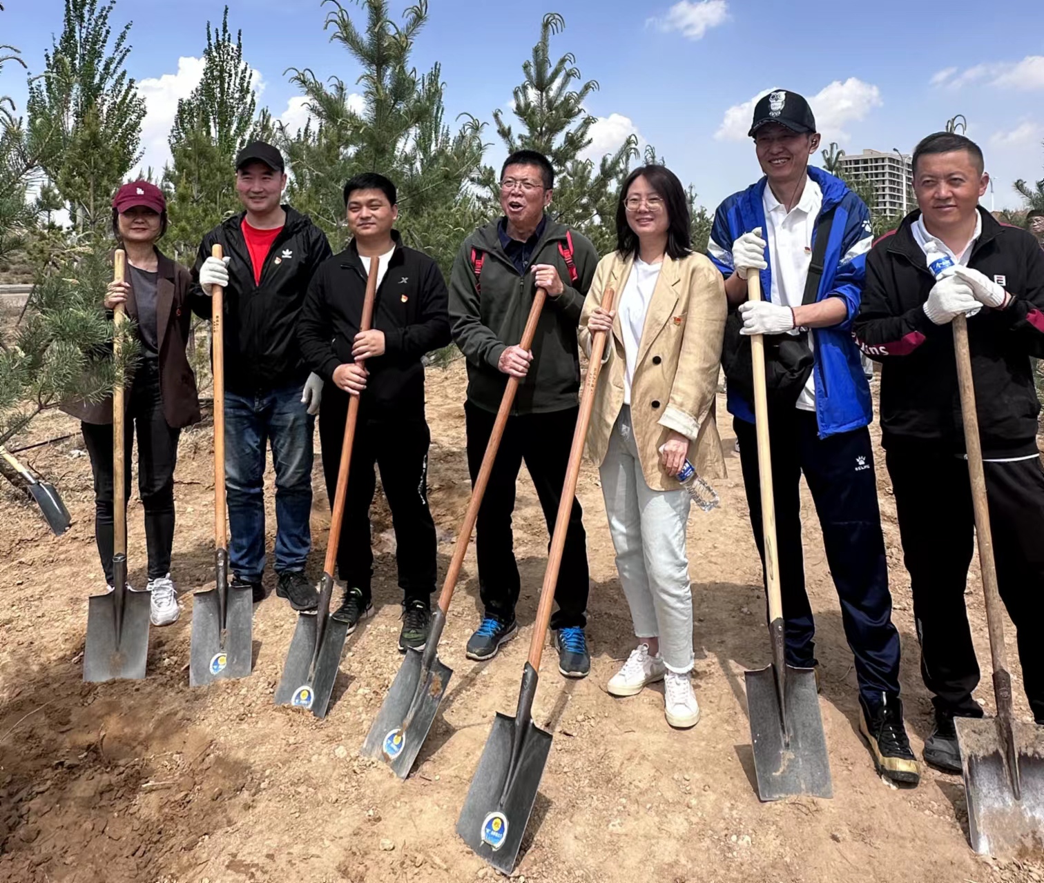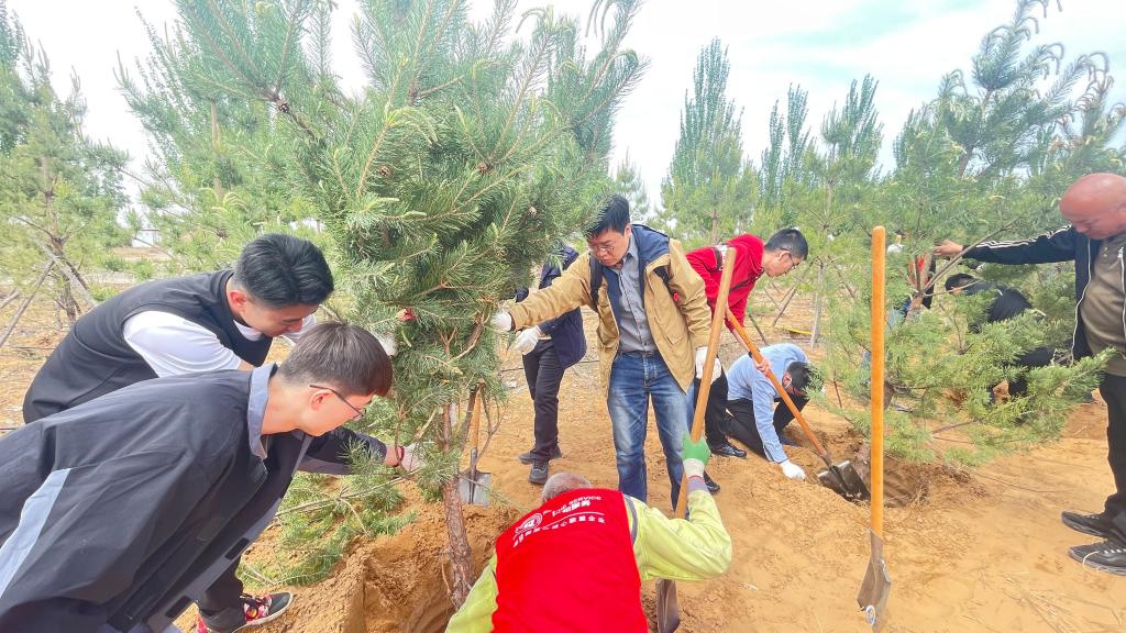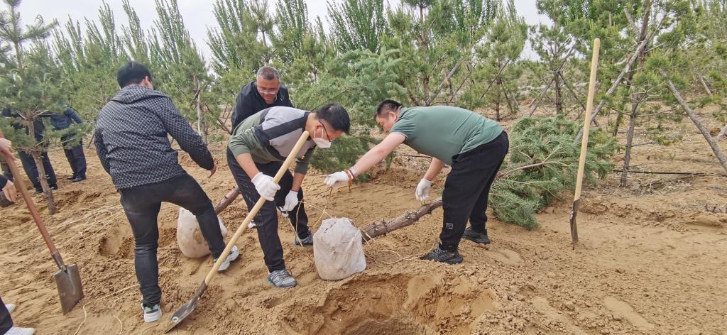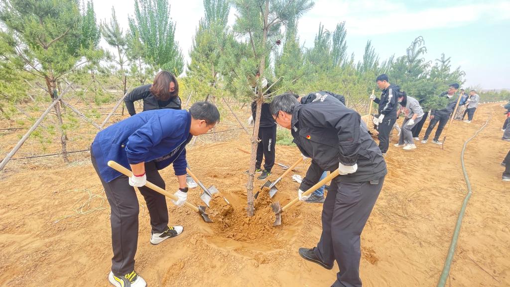 挥锹铲土、扶正树苗、培土围堰、提水浇灌,植树现场一派热火朝天的景象。大家一边劳动,一边与现场工作人员交流,认真学习苗木习性、生长周期、管理养护等知识。经过2个多小时奋战,120多棵樟子松错落有致、迎风挺立,为校区更添勃勃生机。活动结束后,共同参观了准格尔旗博物馆铸牢中华民族共同体意识实践教育基地和现代煤业模拟矿井展厅。