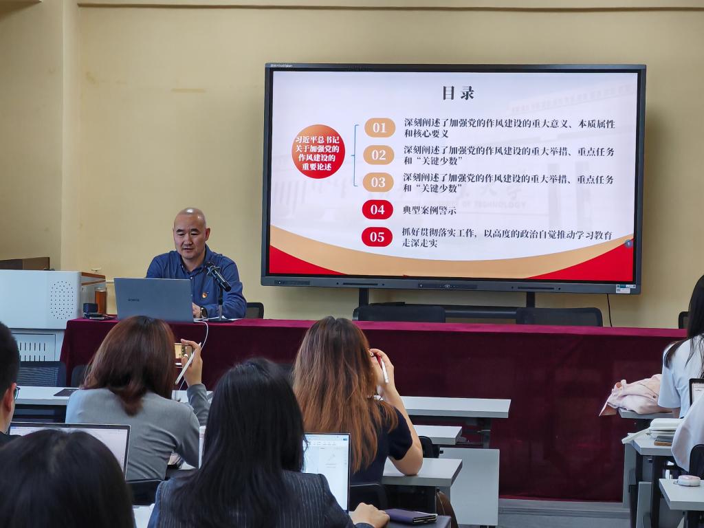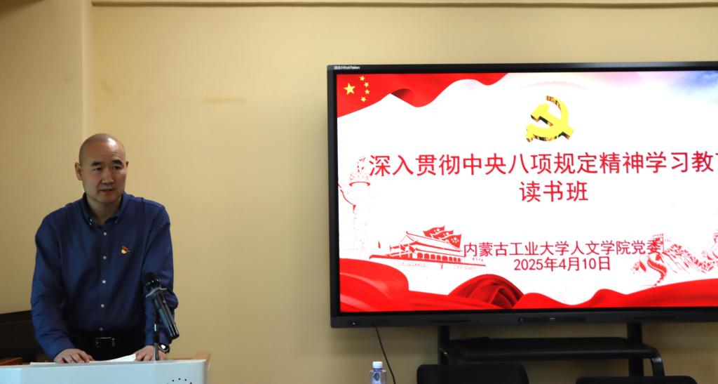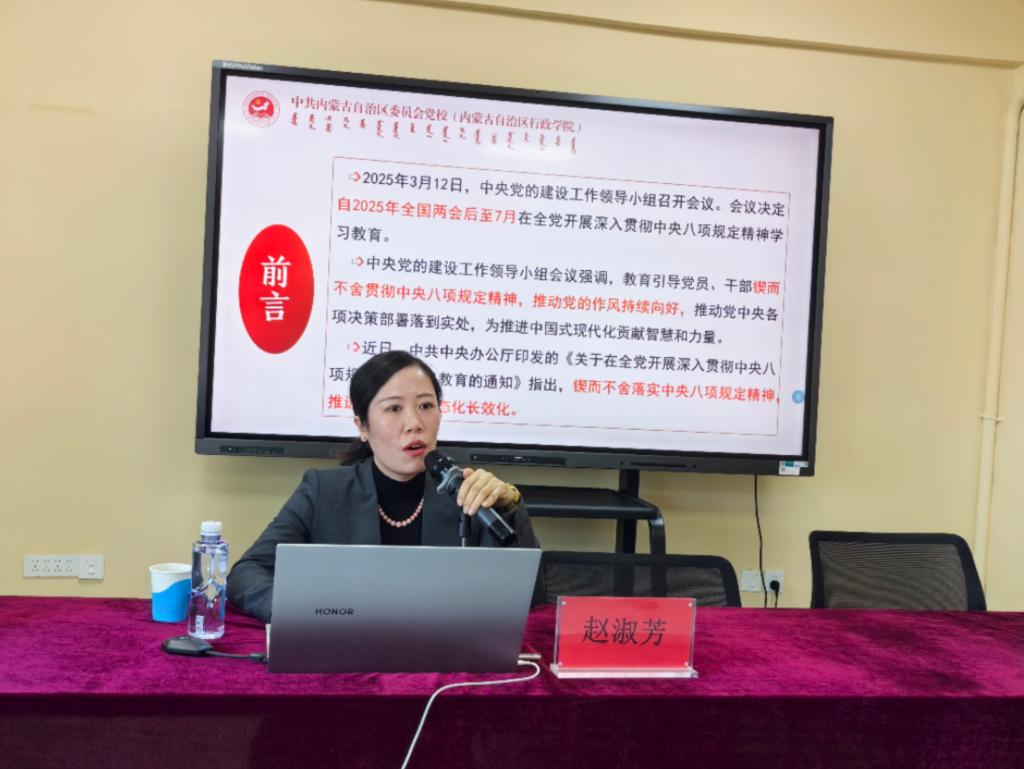 读书班期间,学院党委书记马利强“新时代加强党的作风建设的锐利思想武器——学习习近平总书记关于加强党的作风建设的重要论述”为题讲授党课;邀请内蒙古党校赵淑芳老师围绕中央八项规定的实施成效、重要经验及中央八项规定精神内涵、中央八项规定实施细则等进行专题辅导讲座。围绕规定学习内容,读书班结合警示教育分小组进行集中学习和研讨,总结交流会上,各党支部师生党员代表依次上台发言,结合自身实际,就本次读书班学习心得进行分享交流。