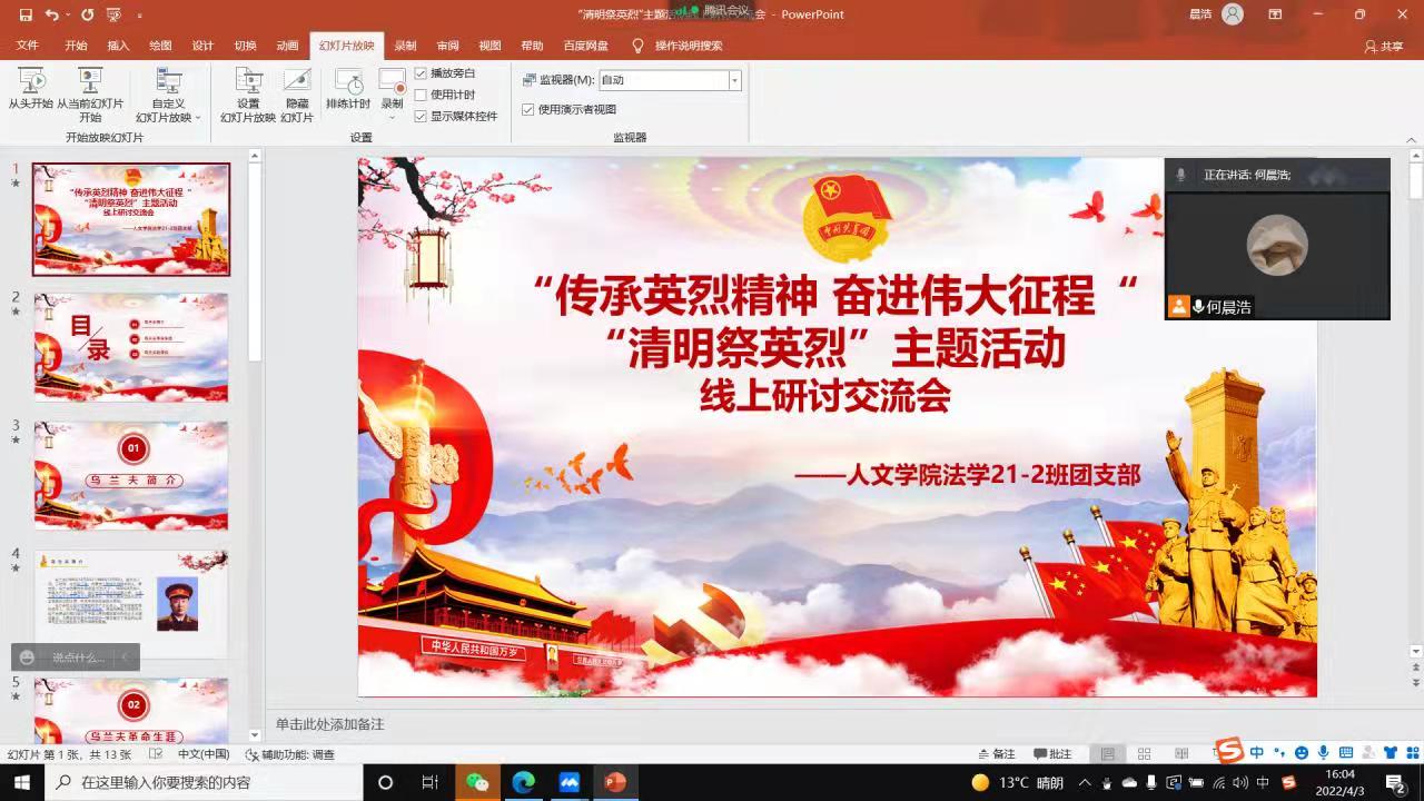 芳草绿叶雨纷纷,又是一年清明节。在祭奠先人、寄托哀思之时,我们也永远不能忘记那些为民族独立解放、为国家繁荣富强而英勇献身的先烈们。习近平总书记指出:“我们要在全社会树立崇尚英雄、缅怀先烈的良好风尚。”4月3日,我院以班级团支部为单位开展“传承英烈精神 奋进伟大征程”线上“清明祭英烈”主题活动,学院各团支部青年参加。