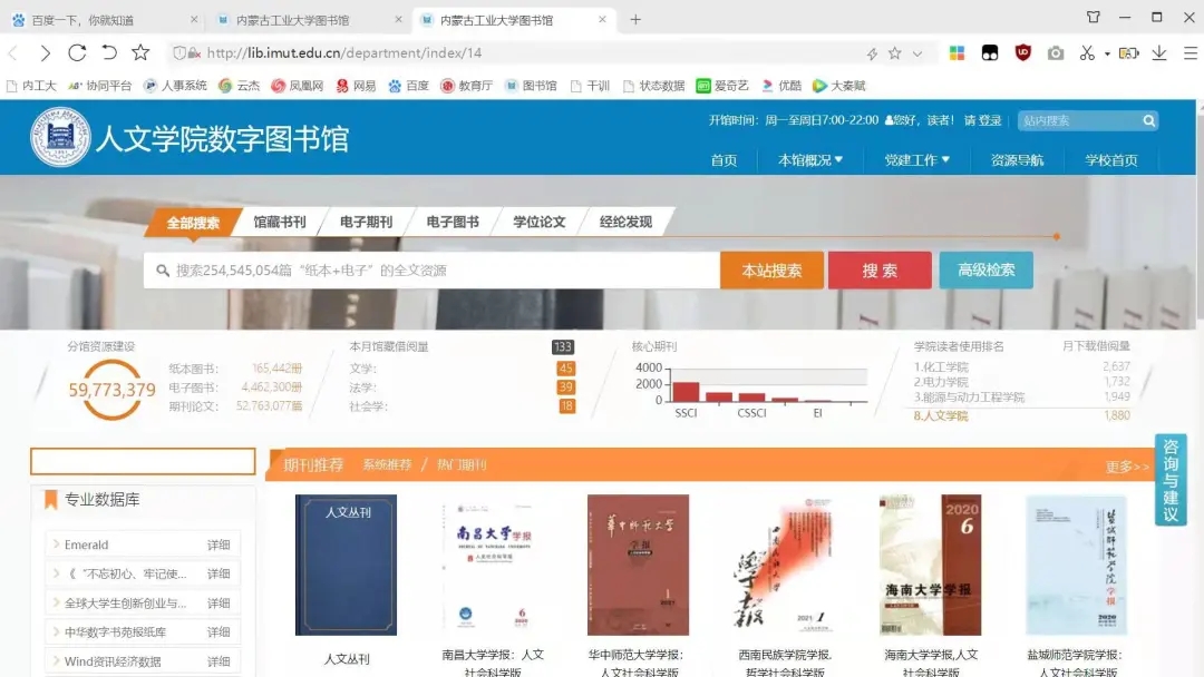yl6809永利官网集团数字图书馆中不仅有大量的电子资源,还有期刊推荐、课题研究中心以及科研专题资源库。在这里你能随意订阅自己感兴趣的期刊、查阅最新的文献资料,还可以在科研专题下参与讨论。不管是我们的法学学子还是社工学子都能得到他们所感兴趣的最新、最权威的资料。