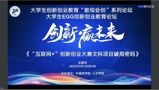 4月15日上午,我院与外国语学院联合举办的大学生创新创业教育“敢闯会创”系列论坛第三讲于线上成功举办。本次讲座邀请了南京信息工程大学工程训练中心主任庄建军教授主讲“互联网+”创新创业大赛文科项目破局密码论坛由我院副院长张莉蔚主持,我院及外国语学院创新创业教育骨干教师及本科生、研究生共计120余人参加了本次活动。