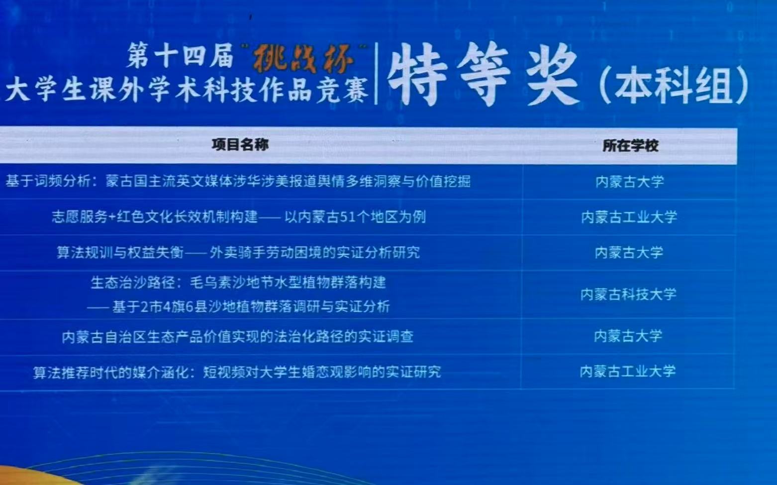 6月10日,内蒙古自治区第十四届“挑战杯”大学生课外学术科技作品竞赛决赛在内蒙古大学落下帷幕。经学院认真组织谋划、培育选拔、校内评审、省赛网评等环节,我院利爱娟副教授指导的本科生“启明星”团队项目《算法推荐时代的媒介涵化:短视频对大学生婚恋观影响的实证研究》从全区入围区赛终审决赛309件作品中脱颖而出,荣获哲学社会科学调查报告特等奖