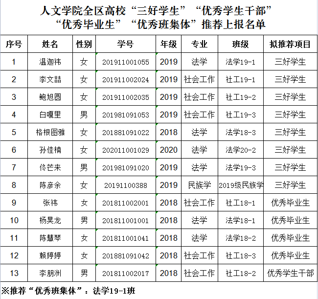 按照《关于推荐全区高校“三好学生”“优秀学生干部”“优秀毕业生”和“优秀班集体”有关事宜的通知》(内工大  党学字[2022]4号)的要求及规定,结合我院实际,开展推荐全区“三好学生”“优秀学生干部”“优秀毕业生”和“优秀班集体”的工作,经过学生本人申请、班级民主评议、学院团学办公室评选审核、学院党政联席会议讨论通过,拟推荐鲍旭圆等8名同学“三好学生”,陈慧琴等4名同学“优秀毕业生”,李朋洲同学“优秀学生干部”,法学19-1班“优秀班集体”。根据有关文件精神现将审核初选结果进行公示。
