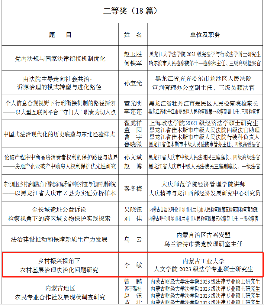 喜报│我院李敏同学荣获《乡村振兴视角下农村基层治理法治化问题研究》论文二等奖