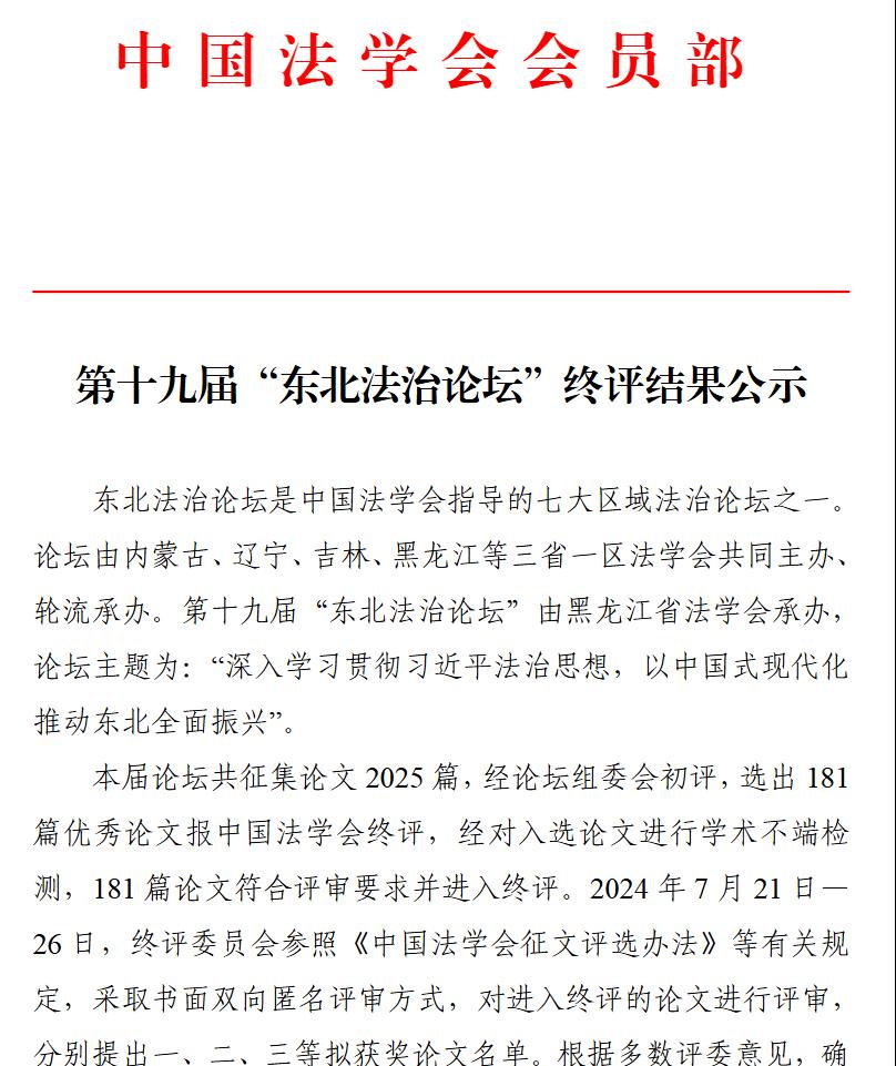 第十九届“东北法治论坛”以“深入学习贯彻习近平法治思想,以中国式现代化推动东北全面振兴”为主题,共征集学术论文2025篇,经过严格评审,仅60篇论文脱颖而出。李敏同学的论文,深入探讨了农村基层治理法治化的重要问题,其研究成果具有较高的学术价值和实践意义。