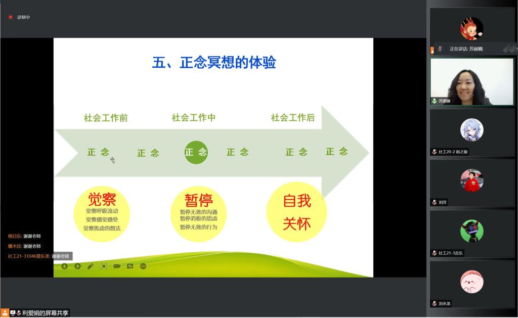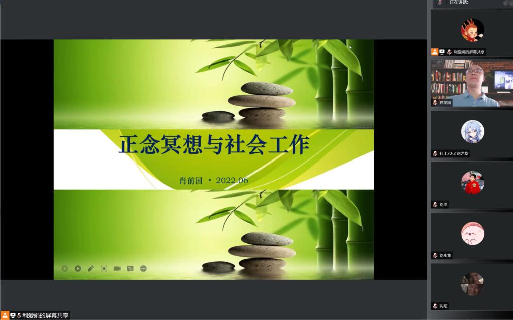 6月9日下午,yl6809永利官网集团于线上举办人文讲坛”第讲。邀请重庆文理学院副教授、国内知名正念研究专家肖前国副教授通过在线平台做“正念冥想与社会工作”专题讲座,学院部分教师社会工作专业本科生以及MSW研究生在线参加,副院长苏丽娜主持。