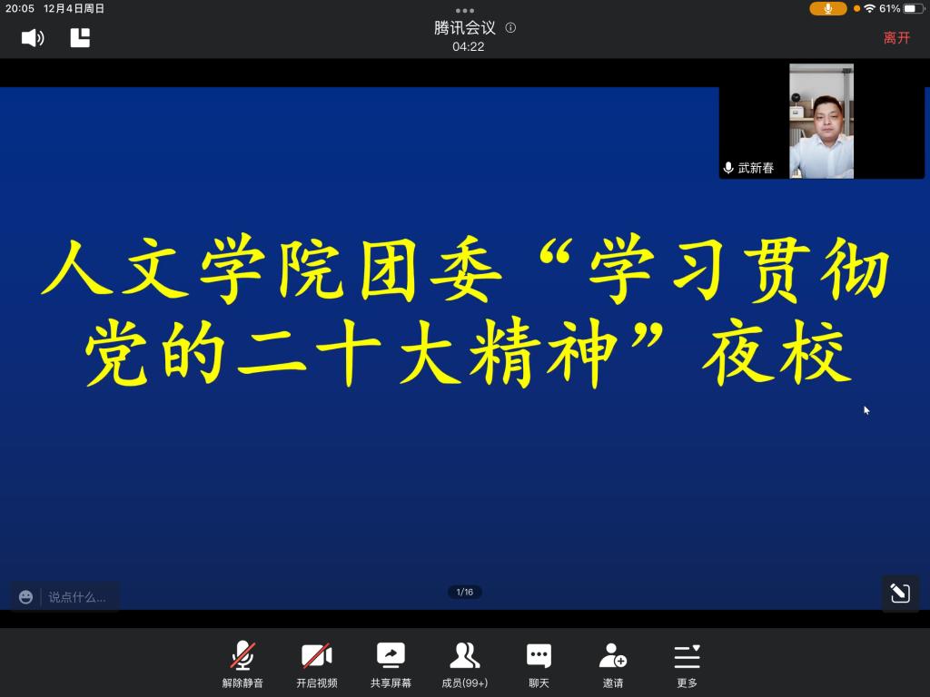 12月4日-6日,学院团委开展“学习贯彻党的二十大精神”夜校培训,学院党委副书记、副院长武新春及全体学生参加,学院团委书记孔德豪主持。夜校开班式上,武新春从党领导青年创造历史伟业、用党的科学理论指引青年成长成才、用党的理想信念引领青年勇担使命和用党的伟大精神激励青年爱国奋斗四个维度,结合学院实际情况为青年学生全面地、系统地解读了党的二十大关于青年工作的相关论述,并就如何学好、贯彻好党的二十大精神提出了要求。夜校期间,孔德豪组织全体团干部、团员、青年学生围绕解读党的二十大报告、《中国共产党章程》等内容分期进行了专题学习,实现学院学生学习全覆盖。