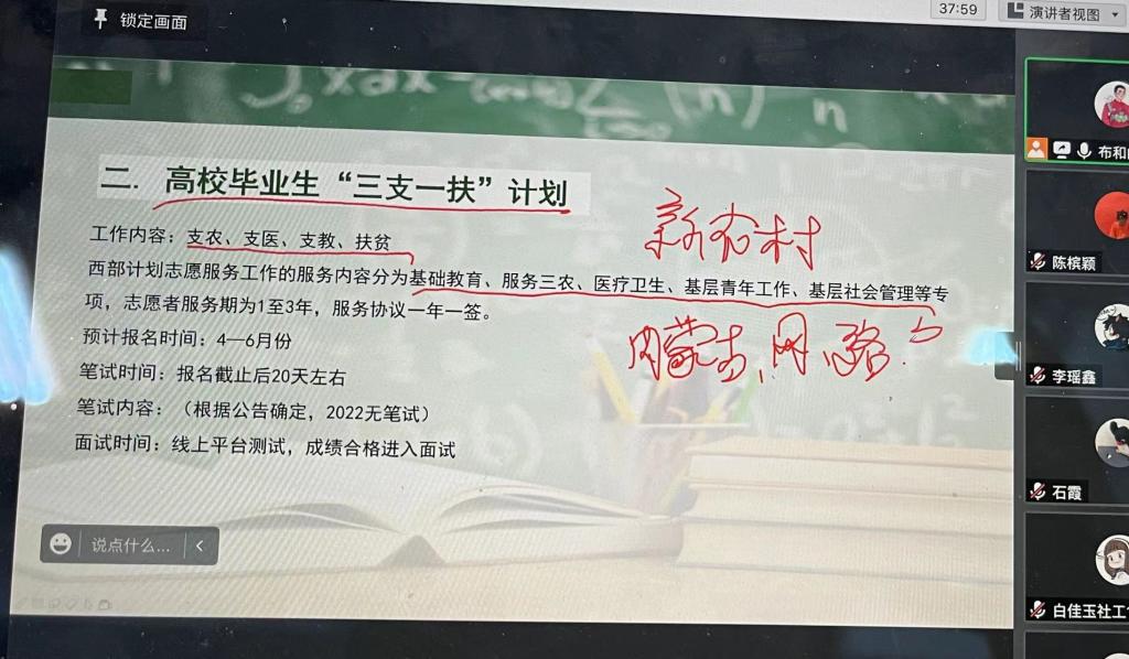 为推进毕业生就业工作,加强毕业生基层项目考试了解4月19日下午,yl6809永利官网集团通过腾讯会议举办2022届毕业生就业专项辅导4月篇——基层项目考试政策解读及备考指南讲座,学院就业指导老师陈槟颖主持,公考培训机构讲师李政朝助讲,2022届毕业生参加。