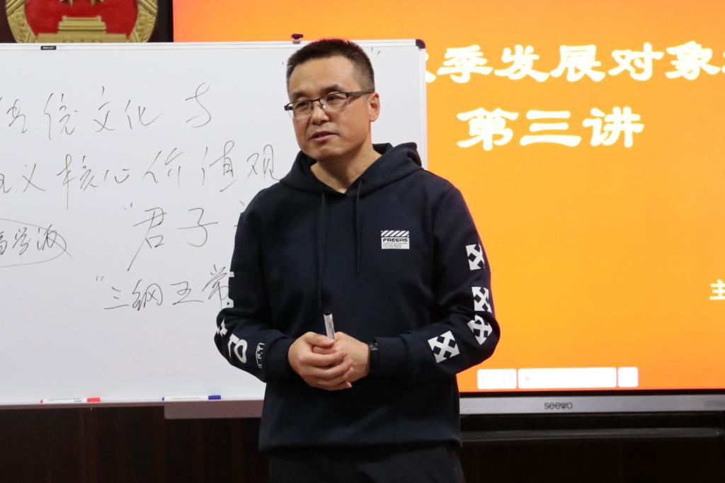 本次培训,文宗川“中国传统文化及社会主义核心价值观”为主题。引用余秋雨书中的内容,提到“人格是一定程度的行为方式和为人处世,中国的集体人格是以儒家为代表的君子之道”。接着,将中国的传统文化与西方文化做对比通过表面现象认识背后深层次的内涵来引出文化是整体这一概念 ,并从“君子怀德,小人怀土”“君子之德风,小人之德草”“君子成人之美,小人反是”“君子周而不比,小人比而不周”“君子坦荡荡,小人常戚戚”“君子中庸”等八个君子之言具体开讲,并鼓励同学们努力争做中国特色社会主义新时代的有为青年。最后,文宗川对社会主义核心价值观“国家制度层面”“社会集体层面”“公民个人层面”这三个层面进行深度剖析。他认为,学习和研究中国传统文化,并加以继承、弘扬和发展,对国民全面素质的培养起着不可估量的正面作用。他希望全体发展对象要积极践行社会主义核心价值观,为实现中华民族伟大复兴中国梦贡献自己的力量。
