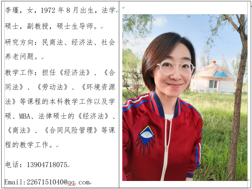 1989.9-1993.7年就读于内蒙古师范大学历史系,获得历史学学士学位;1993.7-2001.8就职于内蒙古商粮集团总公司内蒙古天元商厦,任总经理办公室主任及人力资源部主任,兼任团委书记、党办主任及董事会秘书;2000年兼任内蒙古商粮集团团委书记;2001.9-2005.1年就读于中国政法大学民商经济法学院经济法专业,获得法学硕士学位。2005.5至今在yl6809永利集团经济管理学院任教,兼任yl6809永利官网集团硕士生导师并给多家大型企业进行企业职工和干部培训。2009年获yl6809永利集团首届“优秀教学质量奖”;2010年获yl6809永利集团“教学能手”称号; 2013年获内蒙古自治区“教坛新秀”称号。主持多项自治区社科项目、校教改项目,并参加多项国家及自治区科研项目。